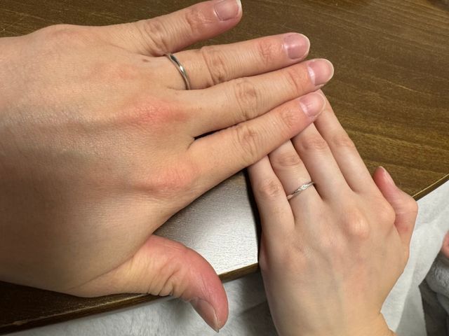 つけ心地がとてもよいです。ストレートやVのリングも試着しましたが、ウェーブが自分たちの手にはしっくりきたので、こちらのリングを選びました。またダイヤモンドの輝きがとても美しく、キラキラ輝くたびに幸せな気持ちになります。