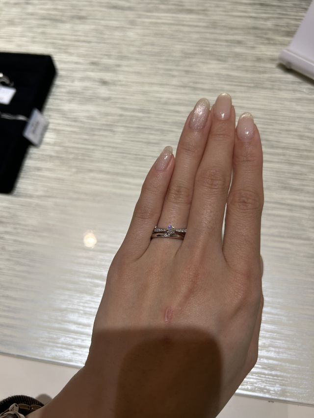 本当にデザインが豊富です。他のブランドでは見ないようなデザインがあります。わたしたちはストレートで動きのあるデザインの指輪を探していたため、そのようなデザインの指輪をいくつか提案していただき、試着しました。