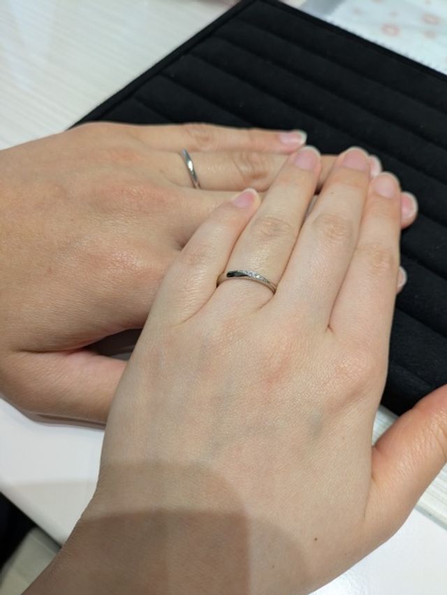 ダイヤがぎゅっと入っていて、とてもキラキラして品質が良い。指輪の品質や作り方のこだわりを聞いて、より良いなと思いました。華美すぎずシンプルすぎず素敵なデザインです。婚約指輪との重ね付けとも相性が良くて、とても気に入りました。