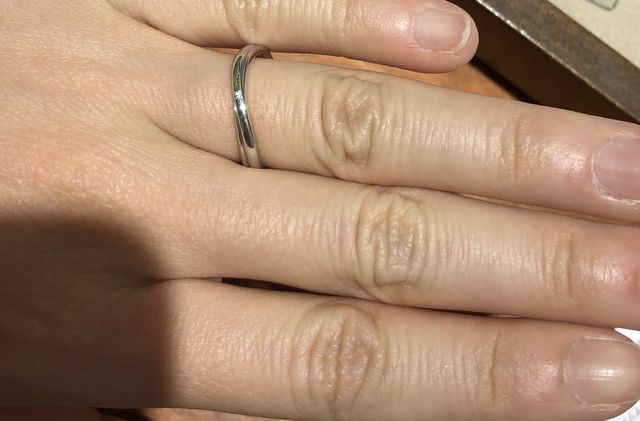 複数の店舗を見て回りましたが、この指輪が一番付け心地がよかったです。全体がとても丸みを帯びており、指への負担が少なく感じました。また、デザインも2つの線が重なり合うようなデザインがとてもかわいいです。