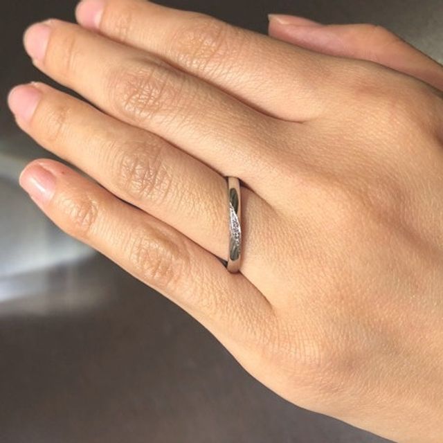 非常につけ心地が良かったのが決め手になりました。デザインでは他にも幾つか候補があったのですが、最終的にはシンプルなデザインのこのリングにしました。ダイヤの輝きは程よく、ウェーブの入ったデザインは指が綺麗に見えるので気に入っています。