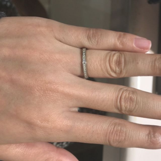基本的に毎日着けるものなのでつけ心地を重視して選びました。シンプルで華奢なデザインですが比較的大きめのダイヤモンドをたくさん使っているので、遠目から見てもキラキラと輝いてきれいであり存在感があります。また作りもしっかりしていますね。