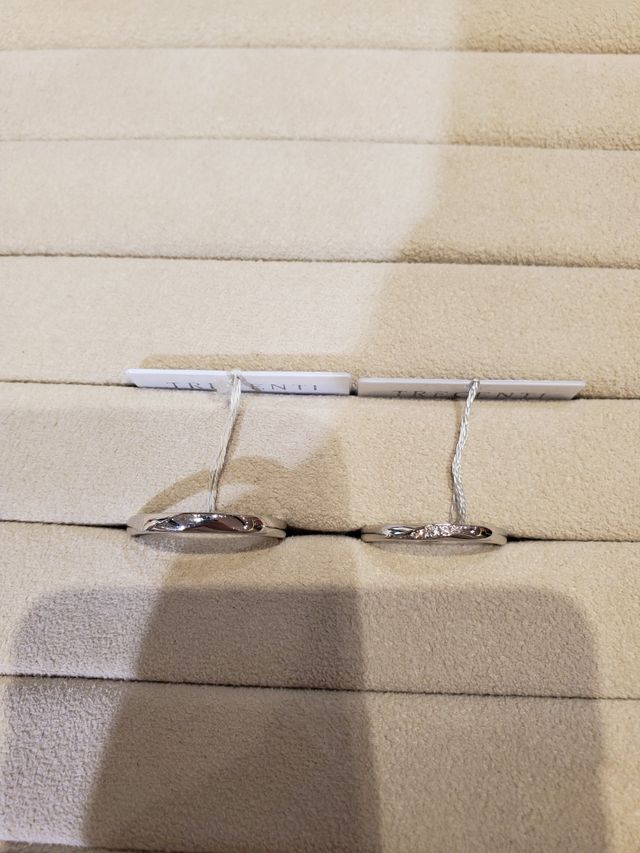 シンプルでありながらリング部分に少し切り返しがあり、結婚指輪らしいデザインや指へのフィット感が素晴らしかったです。男性用の方も単なるストレートではないので、付けた感じが重くなりすぎずしっくりきていました。