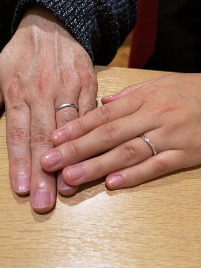 動きのあるV形やウェーブ形の指輪もありましたが、カジュアルになりすぎないストレートタイプを選びました。