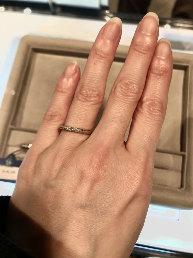 指輪をつけているのを忘れてしまうくらい、つけ心地が良い。指輪の作り方を内甲丸に拘っているだけあり、全く角が張った感じがしない。デザインの斜めのラインが、主張しすぎずとても上品に感じた。見た目以上に、つけた指輪は細めに感じた。