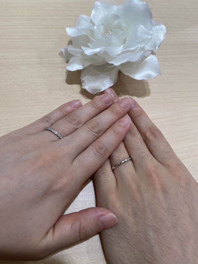 婚約指輪・結婚指輪ともにキラキラ感が欲しかったため私はハーフエタニティ、彼の指輪はプラチナのシンプルなデザインが希望でした。実際に指輪をつけてみると評判の通り着け心地がとても良く、またデザインも理想のデザインだったため購入を決めました。