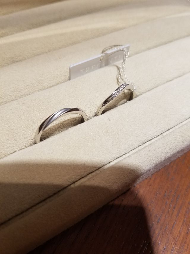 女性用は指輪自体はウェーブのデザインで、ダイヤは斜めに少し多めに入っているデザインが気に入りました。