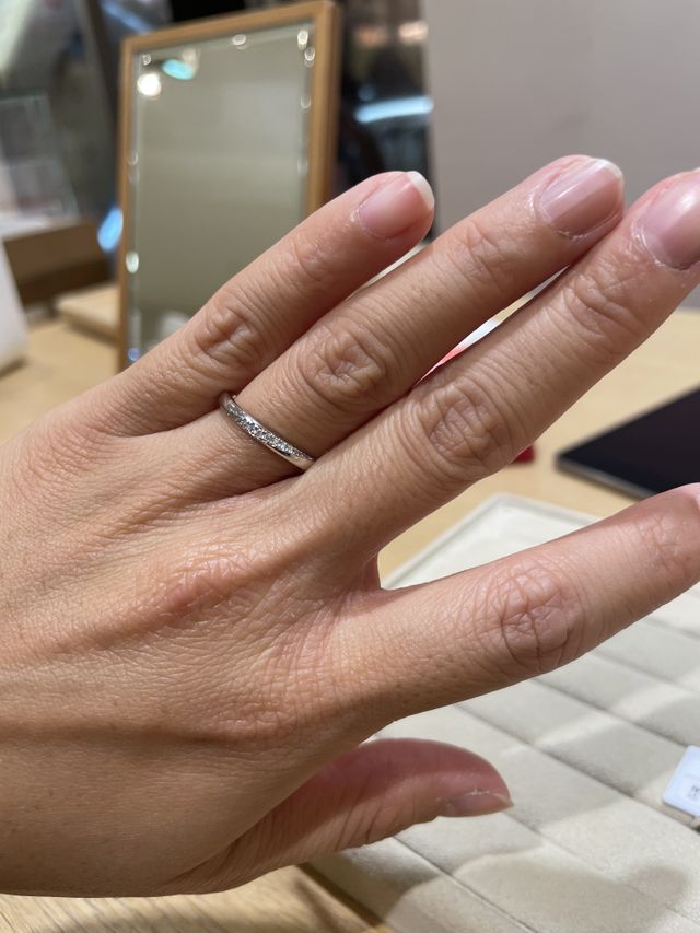 内甲丸という仕立て方法ということで、指への吸い付きが他と比べてダントツに良かったです。結婚指輪は基本的にずっとつけておきたいと思っている方にはおすすめしたいです。デザインも豊富で、好みのものが見つかりました。