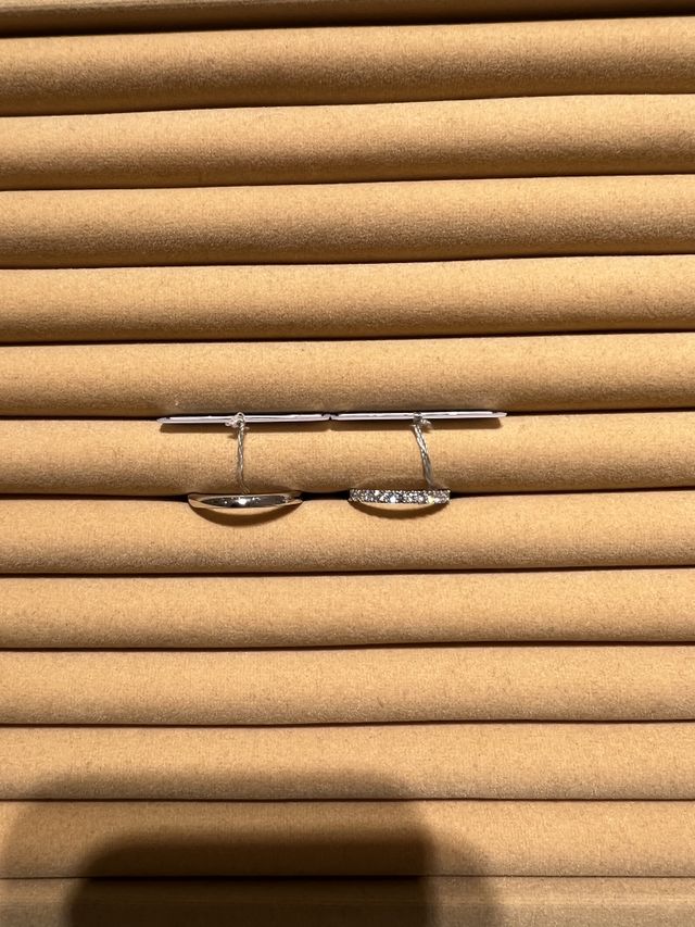 私はエタニティ希望、彼はシンプルなプラチナリングを探していました。エタニティリングをいくつかピックアップしてもらい、何度も試着して自分の指に合うものを選ぶことができました。ダイヤのグレードが良くどの指輪もとても輝いてました。