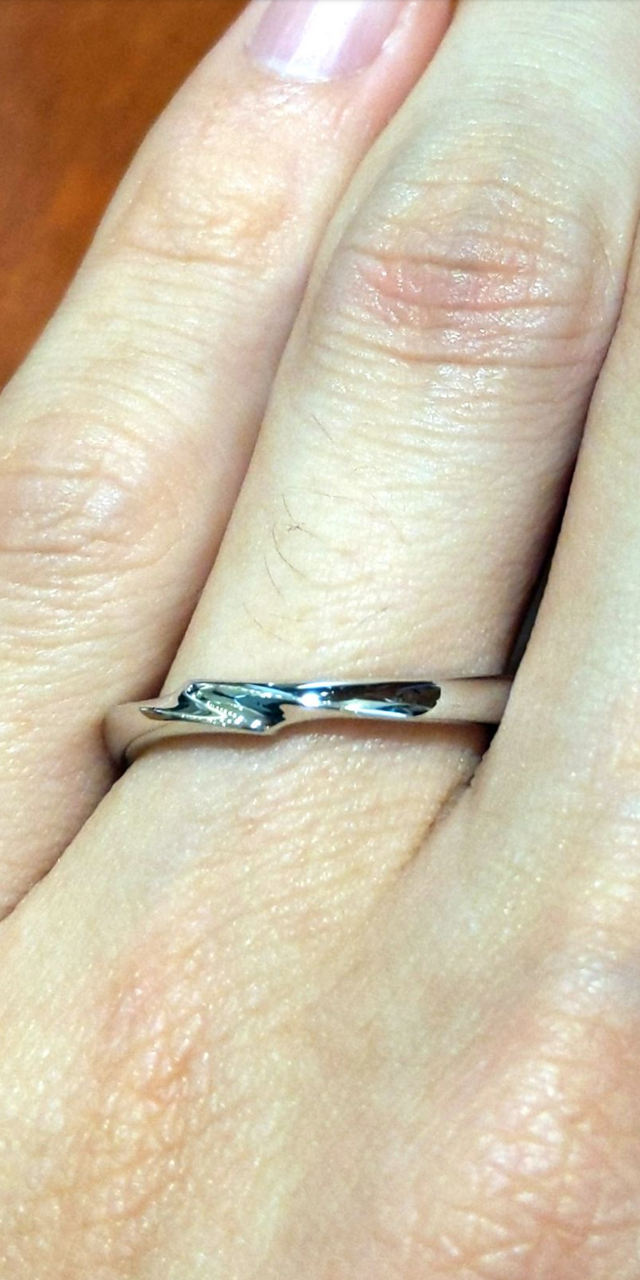 デザイン:真ん中で端と端が合体したようなデザインでオシャレな指輪であった。マット加工のように経年変化する部分はないので、長くデザインを楽しむことができる。