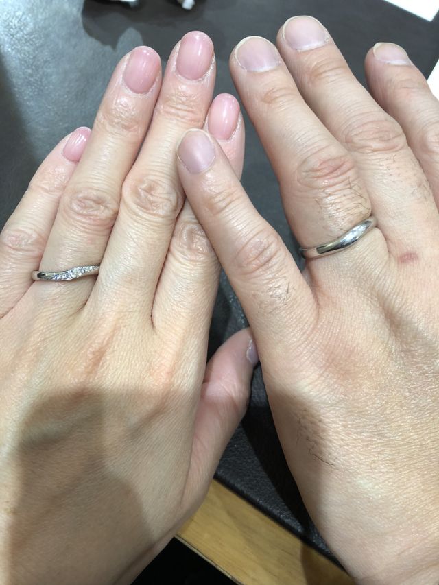 シンプルだけど、華やかさもあり歳をとっても長くつけられそうなデザインなのが良かったです。真ん中のダイヤモンドが大きいので、婚約指輪を貰っていない方にもおすすめできそうな指輪でした。男性の指輪も重厚感があり良かったです。