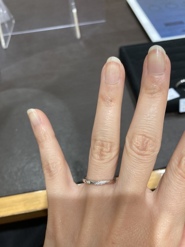 スタッフさんも仰っていましたが、つけ心地が本当に良く、着脱もすんなりできます。こちらで見せていただく前に2店舗見せていただいていたのですが、1番つけ心地が良かったです。デザインはシンプルな物が多く、捻りやダイヤ、マット加工で変化を付けているという感じでした。