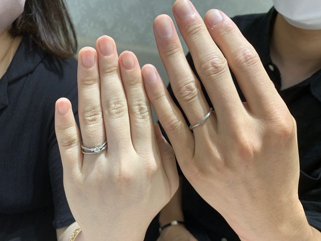 彼女の婚約指輪と一緒に着けられるデザインで、なおかつ男女ペアのモデルということで選びました。指を細く見せてくれるだけでなく、しっかりと指に馴染み、着ける場所を選ばないデザインで2人とも一目惚れしました。
