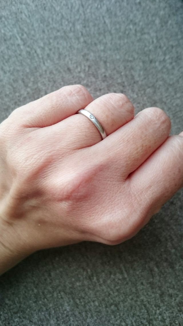 仕事や家事でも気にせず使いやすいように耐久性の良いプラチナ純度の高いもので探しました。号数が小さかったり、細身で華奢なデザインだと刻印の文字数があまり入れられないブランドが多かったですが、こちらは十分な文字数でしたのでこの指輪に決めました。小さい丸いダイヤがかわいいです!