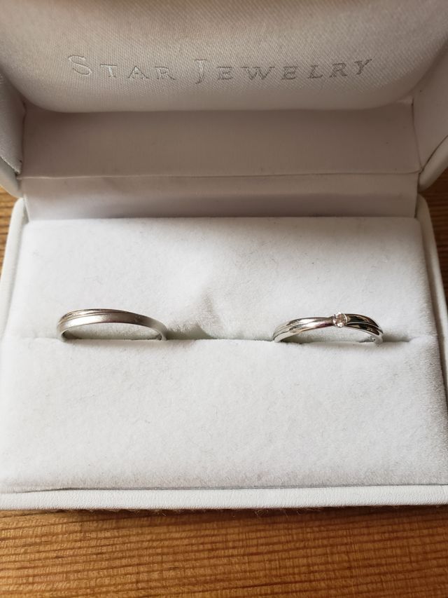 お互いにシンプルなデザインを探していて、わたしは中心にダイヤが入っているものを選びました。角度によってキラキラ光るので手元が華やかになります。夫は逆に光沢のないマット加工がされているものを選び、希望に合ったようで喜んでいました。