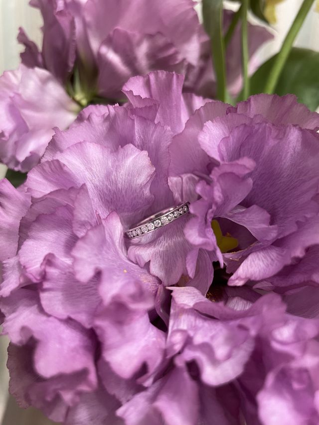 もともとデザインはハーフエタニティと決めていましたが、レール留があまりなく、ふらっと立ち寄ったスタージュエリーさんで、ダイヤの質、デザイン、ダイヤの留め方、幅、全てが揃ったため、購入を決めました。