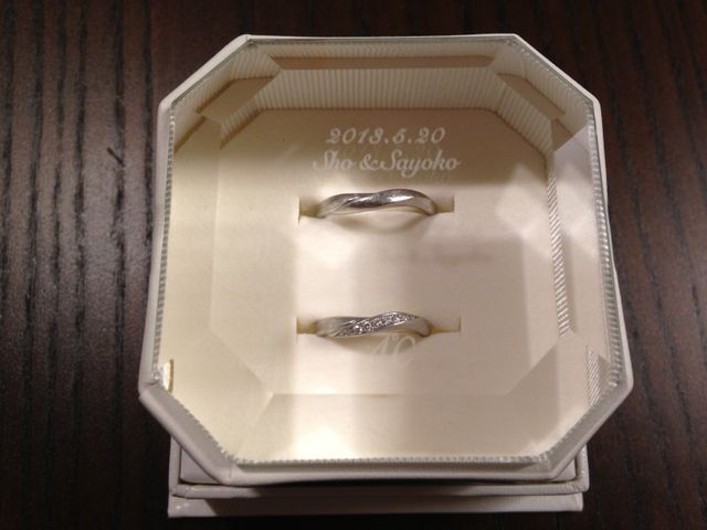 婚約指輪はなしで、結婚指輪のみの購入を決めていたため、シンプルかつ飽きないデザイン、それでも華やかな指輪を探していました。ひとつダイヤよりもライン状にダイヤがあしらわれているものに目がいき、リボンのように斜めにねじれが入ったこのデザインに一目惚れしました。男性用の指輪はデザインは同じですが、ダイヤはなく、少しくすんだような色味が大人っぽくてよかったです。