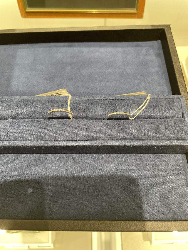 細身で華奢なデザインのものを求めていたので、男女共に細身のデザインが気に入りました。女性ものには石が1つついていて、控えめではあるけれどよかったです。その石も表面のひっかかりも少なく、取れる心配もなさそうでした。