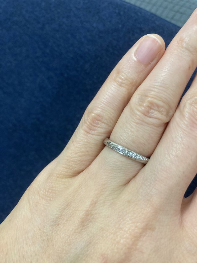 斜めにメレダイヤが入っているデザインなので、ストレートタイプでも指に馴染んで見えます。華奢で可愛らしいデザインの指輪もありましたが、年齢を重ねても着け続けられるように、ある程度の重厚感があるものを選びました。