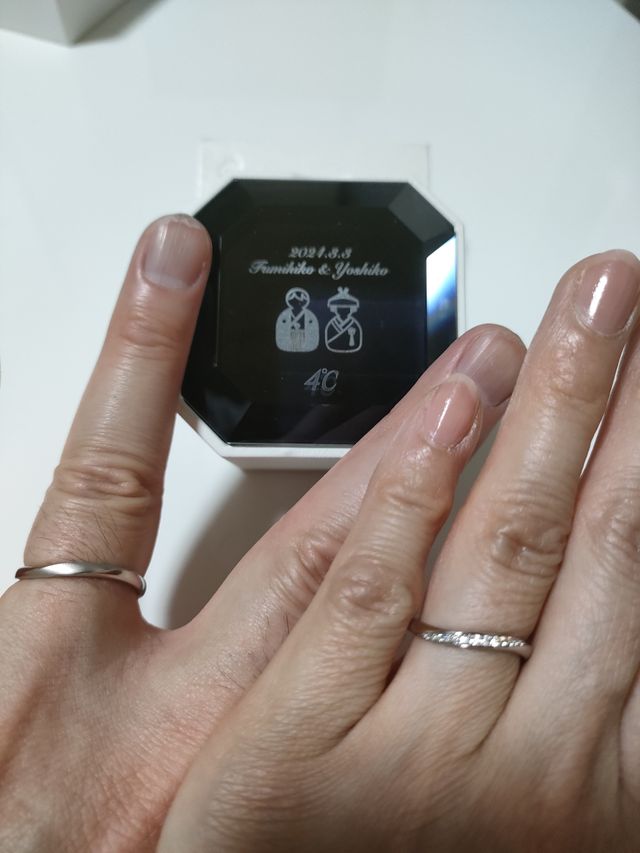 4℃は以前から上品で可愛いデザインが好きで、ピアスや指輪などを購入したりしていましたが、今回は結婚指輪を探すにあたり、やはり上品さがあるものが良かったので、ブランドの信頼もあり丈夫さを重視していたので、4℃を選びました。