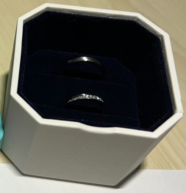ダイヤモンドが多い為、どの角度でもキラキラして見えるのと、仕事上お金を触る機会が多いのですが、Pt950で100円玉よりも硬いため、お金を扱っていても指輪に傷が付きにくいです!