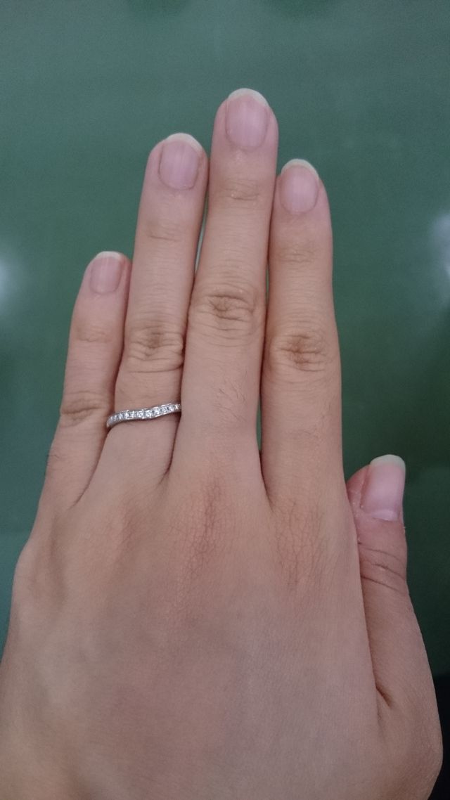 ハーフエタニティリングが気になっていたので、少しカーブがあり指が長く見えると勧められた指輪を試着しました。着けてみるとダイヤがキラキラして、指も長く綺麗に見えるような気がしました。指輪自体は可愛くて価格も手頃で文句なしだったのですが、他に気になっているブランドがあったので、試着だけとなりました。