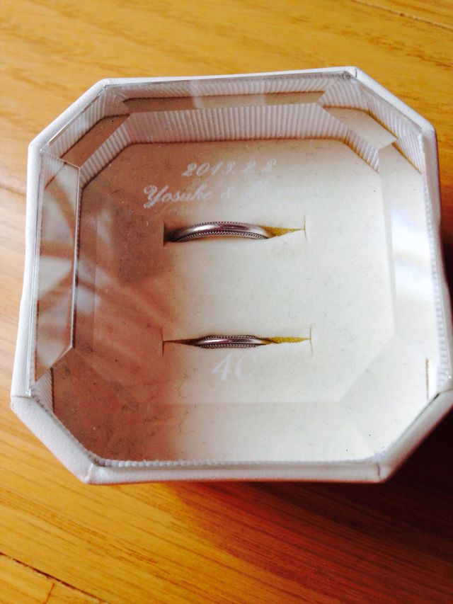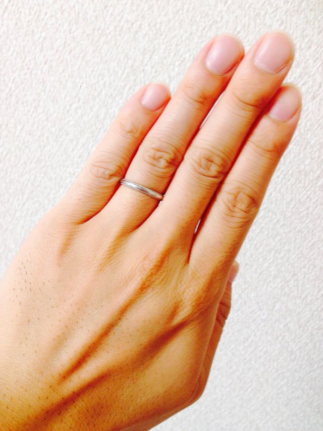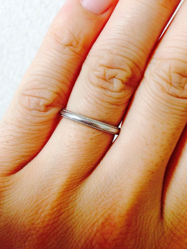 彼女の婚約指輪と重ねづけに合うものを探していて、結婚指輪はダイヤのないシンプルなタイプを選びました。指が綺麗に見えるVライン、Sラインにせずにストレートラインにしたのは彼女の婚約指輪との重ねづけが一番綺麗に見えたため。シンプルすぎず、細めのリングでも存在感を出すために、少し模様があしらわれたこの指輪にしました。
