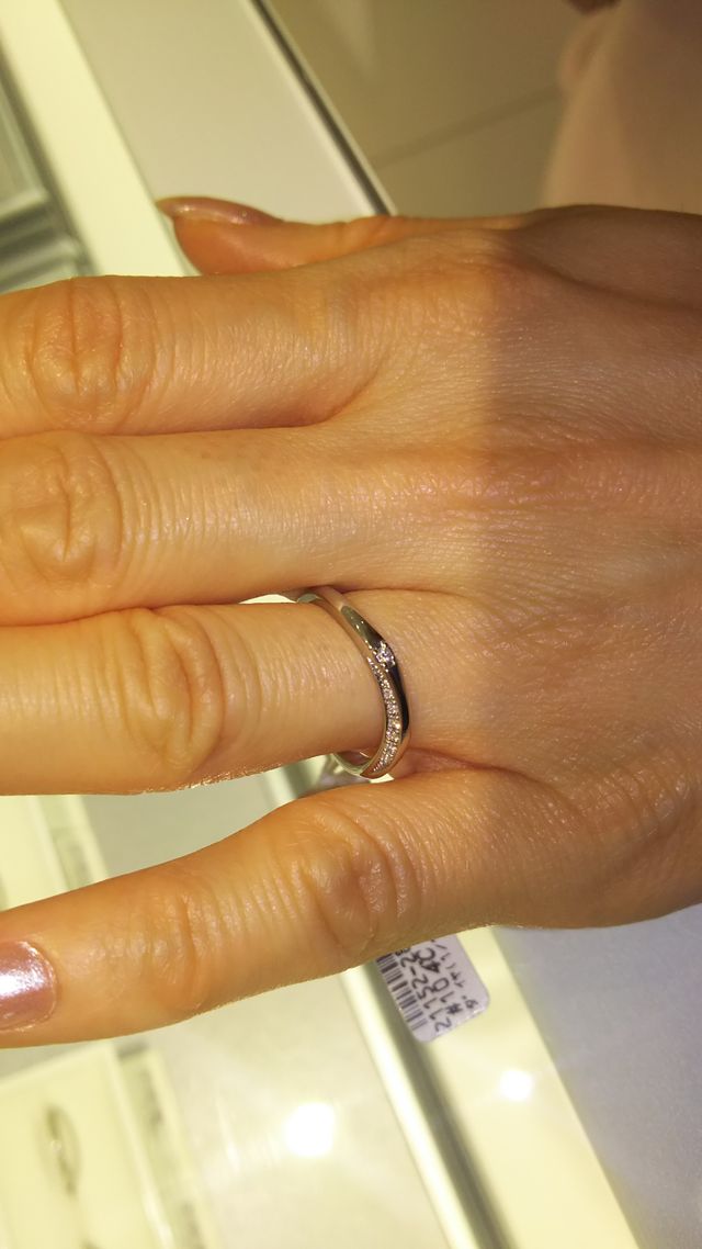 センターと両サイドにダイヤモンドがはいっているので、正面から、横から、どの角度から見ても指が動くたびにダイヤモンドがキラキラしていました。自分からも回りの人からもダイヤモンドが見えるデザインです。エタニティタイプよりもデザイン性があります。