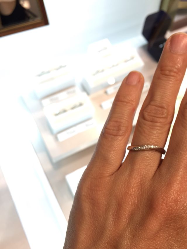指輪のおすすめポイントは、ゆるやかなウェーブ感とダイヤモンドが斜めに入ったのすっきりとしたデザインです。0.5刻みでサイズを選べ、自分のサイズにピッタリ合うものを選べるところも、とても良いと思いました。