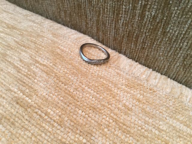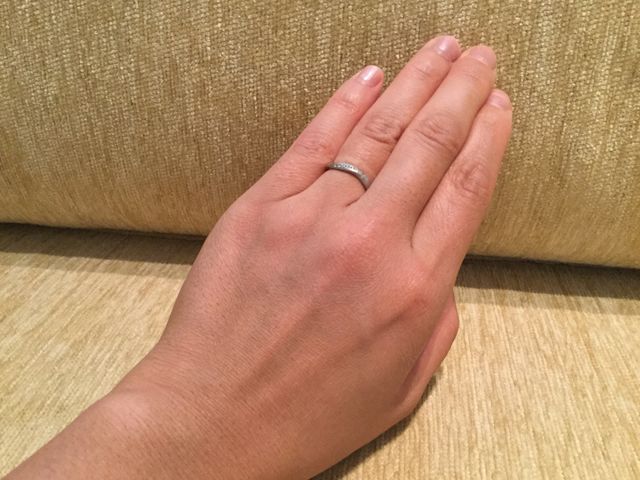 男女共に形状は同じで、女性用ののリングは一部にダイヤモンドが埋め込まれていますが、ギラギラと派手すぎることはなく、毎日つけっぱなしの結婚指輪としてはちょうどよい、品のよい輝きです。