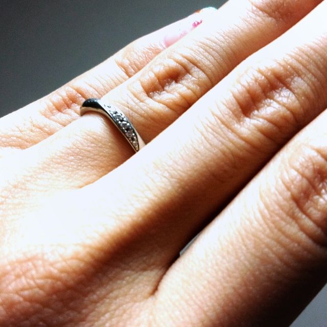 予算とデザインの好みがマッチしたので最終的に購入に至りました。シンプルなデザインですが斜めラインのダイヤが指を綺麗に見せてくれている気がします。また、丸みをおびた形状で楽に取り外す事が出来るので1サイズ小さいサイズで購入しました。