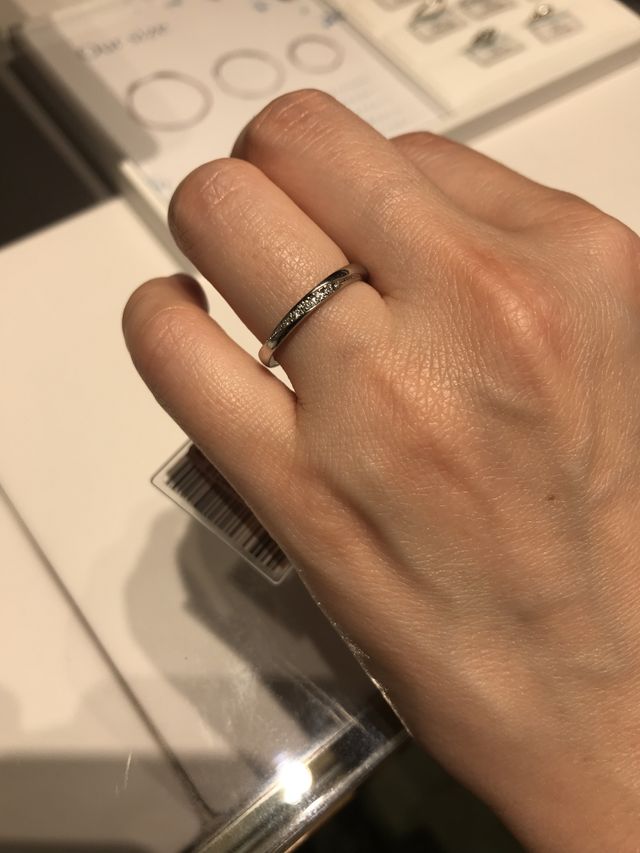 初めて指輪を購入するに当たって、こちらの要望などを色々と相談したところ、この指輪を紹介されました。他の指輪ももちろん試着したのですが、この指輪が気になる今回投稿をさせて頂きました。シンプルにキラキラ光る指輪なので気に入ってます。