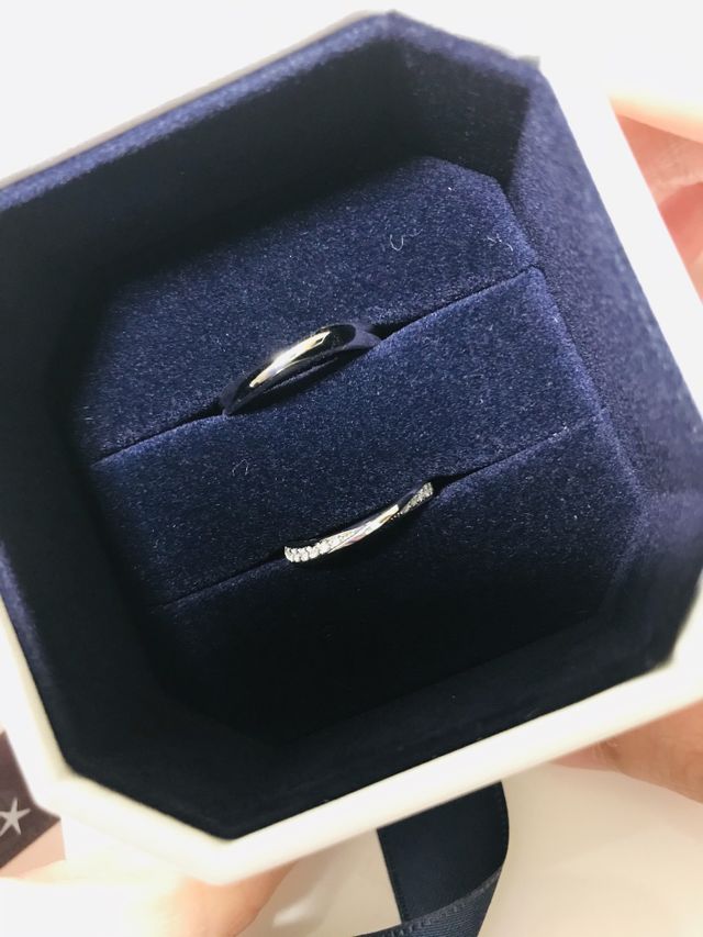ネットで気になっていたものを実際に店舗で試着させて頂きました。中央にくる部分がねじれていて細身になっているので、指が細く綺麗に見えると感じました。男性用も同様にねじれているので綺麗に見えます。他の種類もいくつか試着しましたが、最終的に最初から気になっていたこちらに決めました。