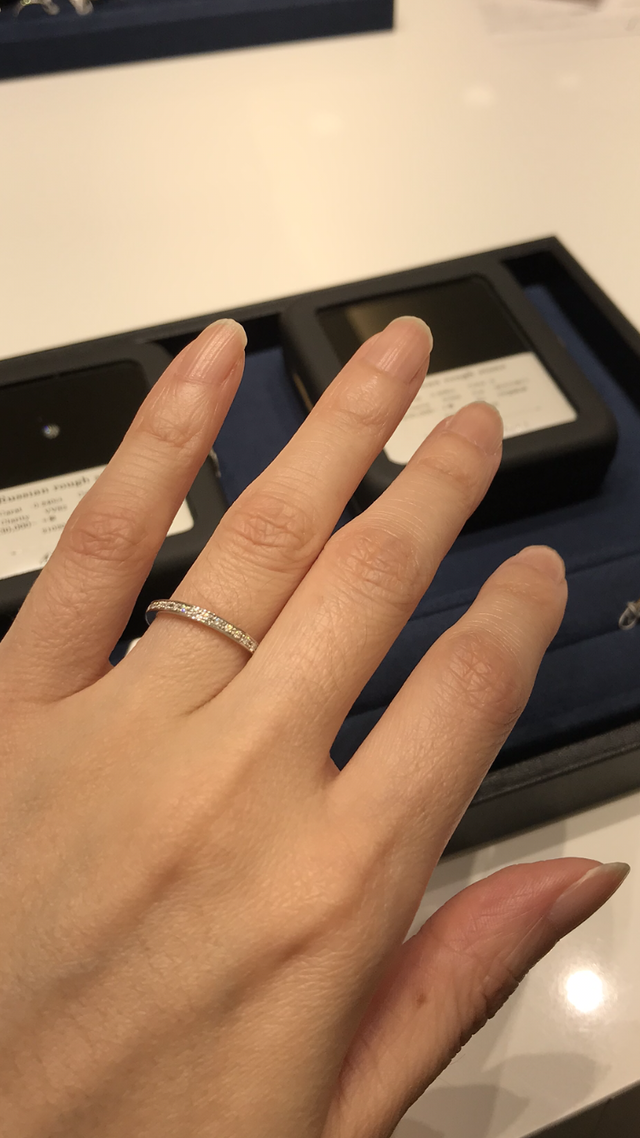 ずっとエタニティリングを探していました。日常付けなので、凹凸の少ないひかかりにくいデザインにしました。指が細いので、幅も細めの控えめな、ハーフエタニティに決定。とても素敵なデザインで大変満足しています。