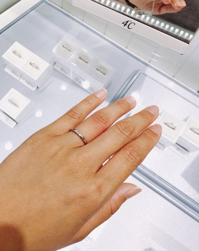 王道のデザインで、飽きがこないシンプルな感じでした。真ん中のダイヤモンドもさりげなくて可愛いです。こちらの指輪はリングの縁(指にあたる部分)が丸く削ってあるとかで、つけてることを忘れそうなくらい、つけ心地がよかったです。
