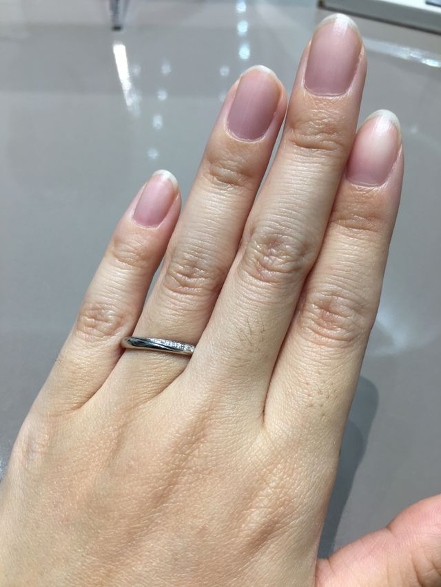 「夜明け」という結婚指輪です。中央のあたりからダイヤが斜めに入っており、シンプルながらも華やかな印象のある指輪でした。とても可愛らしく、ダイヤが数石入っているにも関わらずリーズナブルなところが良いです。