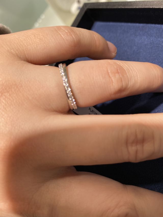 直線のリングですが斜めに石が入っていてとても指が綺麗に見えるデザインでした。そしてとても綺麗なデザインで質感もしっくり指に馴染み、ダイヤの輝きも爪高のデザインなのでとてとキラキラ煌めいていて