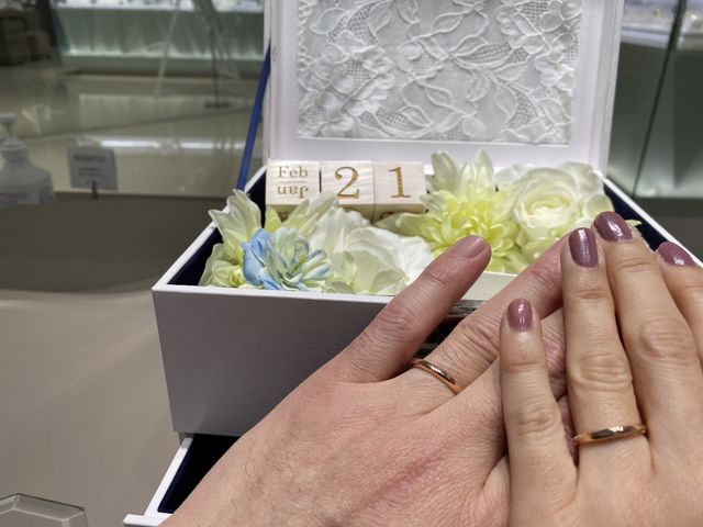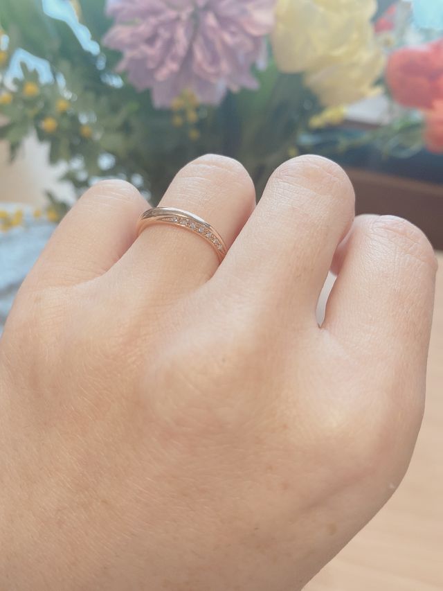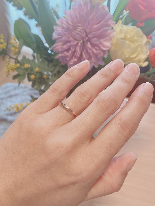 国内ブランドらしい細身で繊細な作りが気に入りました。両サイドにダイヤモンドが7つずつ並んでおり、シンプルでありながら上品な輝きがあります。ピンクゴールドも優しい色味で肌にも馴染みます。たくさんの種類があり、とても悩みましたが、着け心地が一番良かったこちらの指輪を選びました。