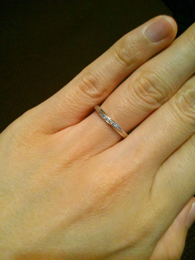 仕事中もつけたかったので、邪魔にならず細身でシンプルなタイプの指輪を選びました。価格もペアで15万前後であり、手の届きやすい価格でよかったです。ペアで25万~30万位の価格帯の指輪が多かったと思います。(ダイヤの大きさにもよりますが、リング幅は太い物程値段は高くなると言われました。)