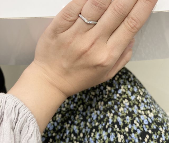 何店舗かまわり、4℃ブライダルさんでやっと理想のハーフエタニティリングに出会えました。ストレートはよく見ますがV字は珍しいと思いますので特別感を感じました。