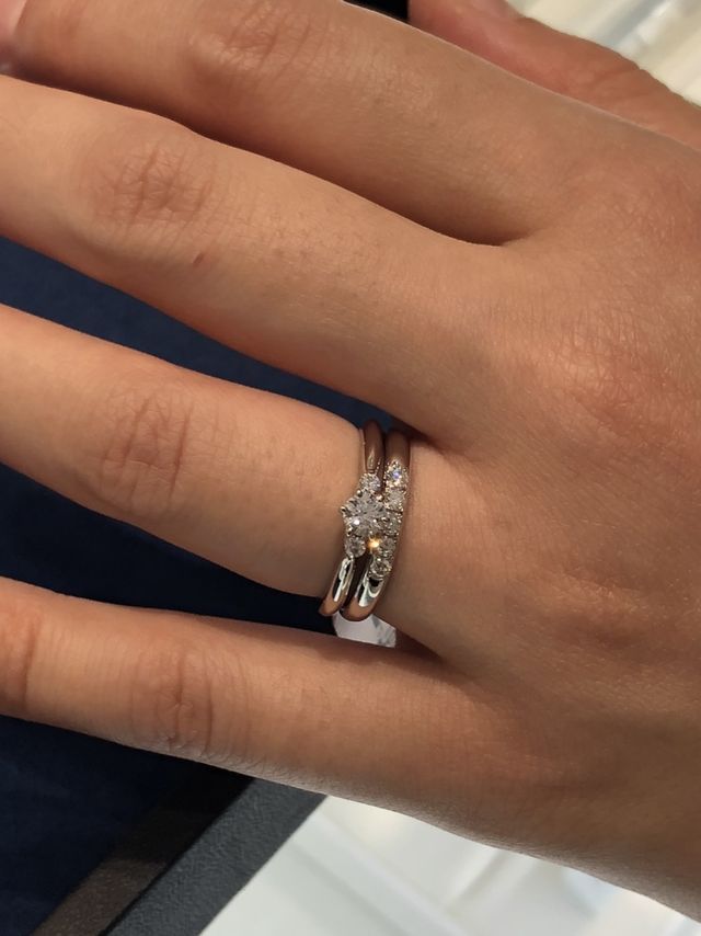 大きめのダイヤが5つついているので、とてもキラキラしていました。写真は、婚約指輪(上)との重ねづけで試着したものです。婚約指輪のキラキラとあわさって、とても綺麗に輝いていました。もともとダイヤのついてない婚約指輪を探してましたが、ダイヤつきのもののほうがよいかも、と思いました。