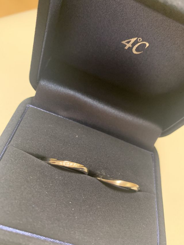 あまり派手すぎるものは好みではなくこちらの指輪に決めました。斜めに入っているラインのダイヤがシンプルながらも存在感のあるところに惹かれました。ペアの旦那の指輪も、デザインが一緒ではないけれど、ペアであるかんじがわかるデザインも決め手です。