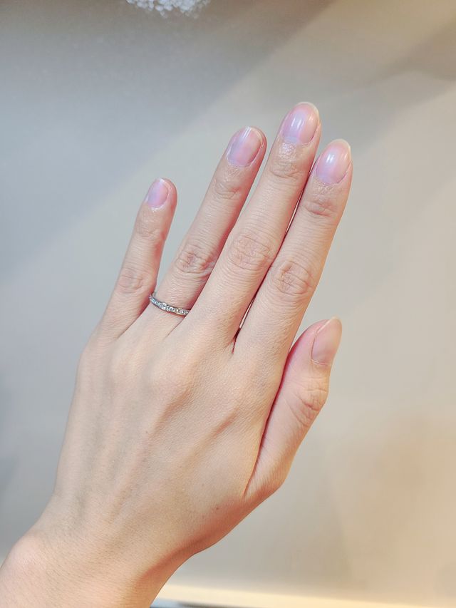 仕事柄指輪が傷つく可能性があるので強度にはこだわって指輪を探していました。そのなかでも可愛いデザイン、と探していたところエタニティリングの種類も豊富で、価格帯もお手頃だったのでこちらの結婚指輪に決めました。