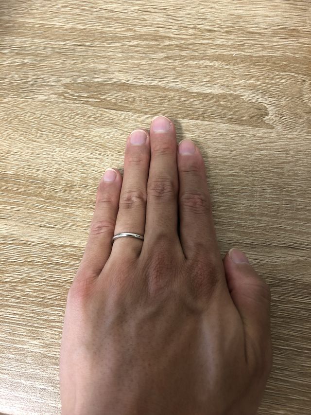 指輪のデザインは妻と合わせたウェーブ型を選びました。妻の指輪にはダイヤが埋め込まれていますが、私の指輪にはダイヤの付いていないものを選びました。指輪は着用時の感覚から幅は短く、厚みは薄い指輪を選びました。