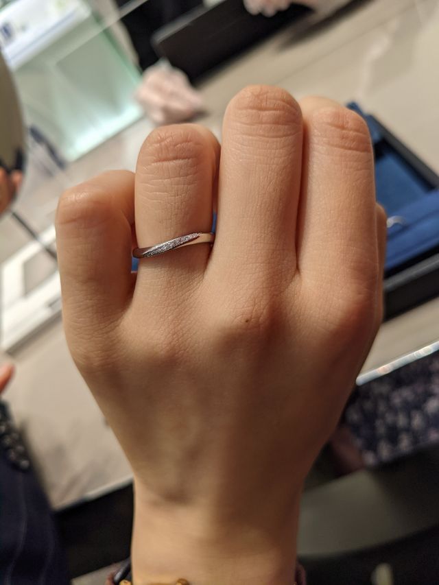 デザインはシンプルで指に馴染むようなものが多かった印象です。ウェーブのラインが指にすごくマッチして、指の形も奇麗に見えた気がします。そして何より驚いたのは、着け心地の良さでした。他ブランドでも着け心地の良さを謳っている所はありましたが、4℃がダントツでした。他ブランドで測ったサイズよりも1以上細くなりました。