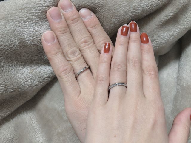 指輪のデザインは夫婦共にシンプルで飽きのこないデザインが良いなと考えていました。私は下半分にだけダイアが一列に入っているデザインにしましたが、ダイアが下向きに指輪をはめると自分から見てキラキラと輝いてるのが見え、ダイアが上向きにはめると部屋などの照明の反射で綺麗に輝いて相手から見た時にすごく綺麗に見えるので、気分や時と場合によってはめる向きを変えたりして、1つの指輪で2パターンの付け方を楽しめるのが良いなと思いました
