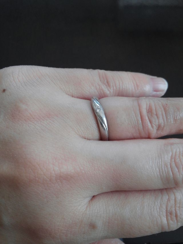 どこのブランドにしようかは、主人がずっと前から決めていたとのことで、それに従うことにしました。デザインも考えていてくれたようですが、実際に店舗に足を運んでいろいろなタイプのものを見せてもらうと、迷ってしまいました。これに決めたきっかけは、全体的に丸みを帯びたデザインが、はめた時にしっくりきたことと、ごつごつした私の指を柔らかく見せてくれたからです。