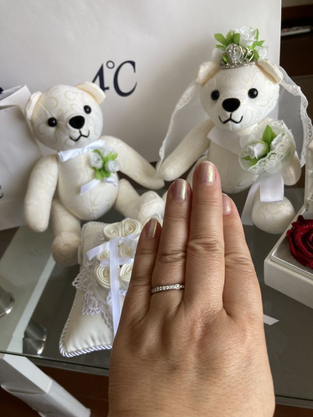 色々迷いましたが、最終的には、ハーフエタニティリング に決めました。最初、少し細めの物を試着しましたが、彼がもう少し太めの方が良いのでは?となり、3㍉くらいの物にしたところ、バランスが良かったので、そちらにしました。シンプルな物も迷いましたが、手元を見る度、キラキラしているのを見ると、ハーフエタニティにして良かったと思います。