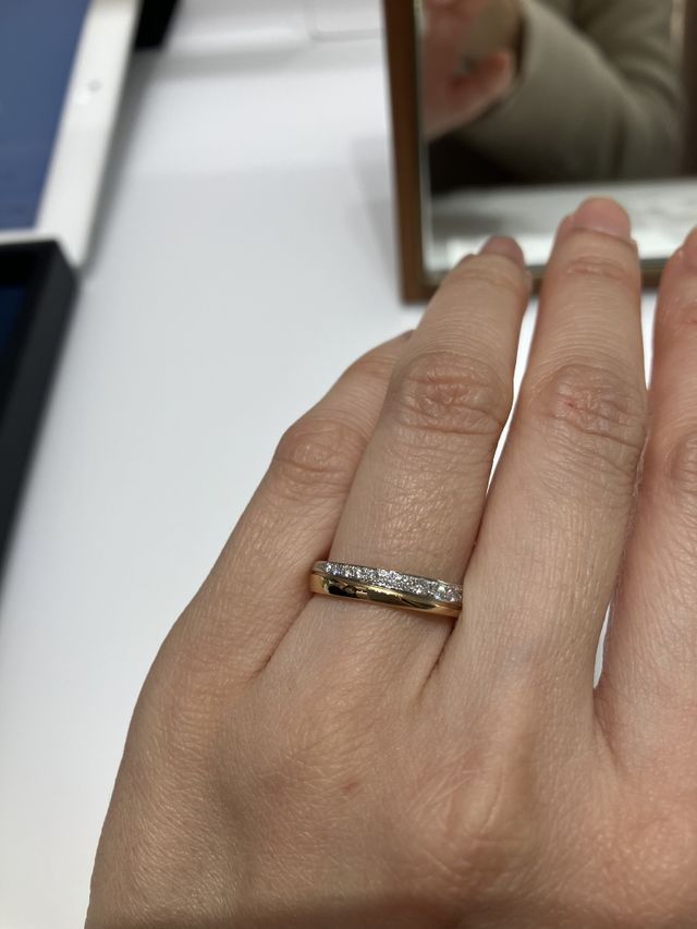 ダイヤモンドが華やかにあしらわれていて、太さもあるリングなので歳を重ねても手元が寂しく見えないと感じました。ダイヤモンドも引っ掛かりがないように埋め込まれているそうで、普段使いも安心できるのかなと思いました。