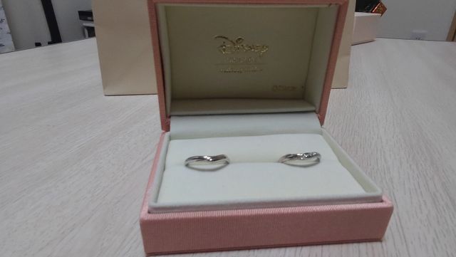 新婦がディズニー(特にミッキー)が好きなのでミッキーでオーダーメイドできるお店で作りました。二人の指輪で波打ってる様にゴールドの流れが入ってるのが良いかなと思います。また見る人が見ればミッキーとわかるけどいかにも「ディズニーのものです!!」と主張していないさり気なくミッキーがいるのも良いかと思います。
